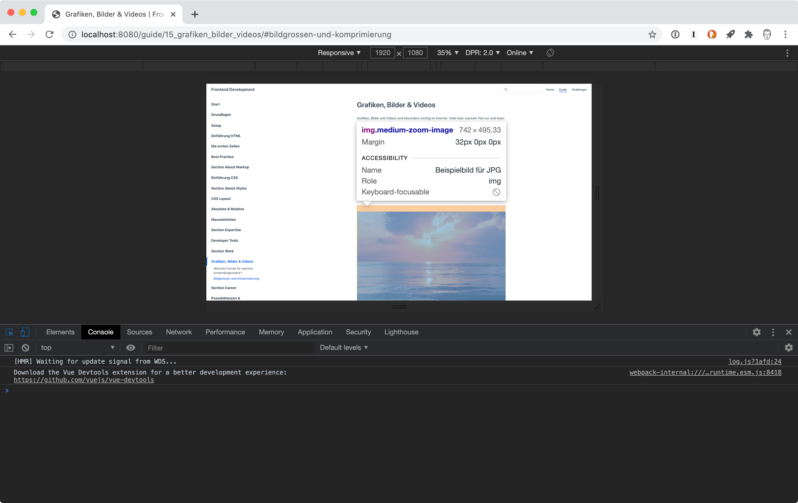 - Untersuche das Bild mit den Developer Tools. Im Responsive Modus kannst du als Auflösung 1920×1080 Pixel angeben. Wenn du das Bild untersuchst, siehst du die Abmessungen. In unserem Beispiel sind das 742×495 Pixel.